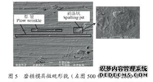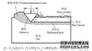 成型過程中,物料在模腔中主要受2個方向的作用力,平行于模腔的切向力和垂直于模具表面的法向力,物料中的硬磨粒在法向力作用下被壓入金屬表面,同時切向力推動磨粒運動,對金屬表面進行切削,這種作用與金屬切削加工或研磨相似,如圖所示;較軟的物料則在循環(huán)載荷下與模具表面突出部位或犁溝產(chǎn)生周期性的接觸,使得該部位金屬材料因反復(fù)塑變硬化而疲勞剝落,形成凹坑和疲勞裂紋,如圖5所示,但該現(xiàn)象在模具魔磨損過程中作用較弱。