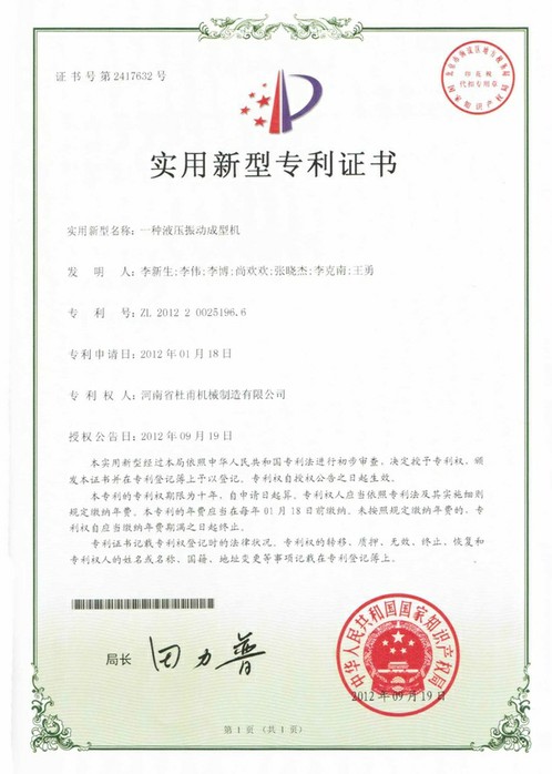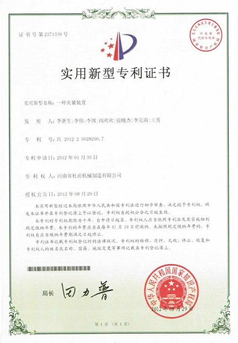 實(shí)用新型專利證書--銘澤機(jī)械